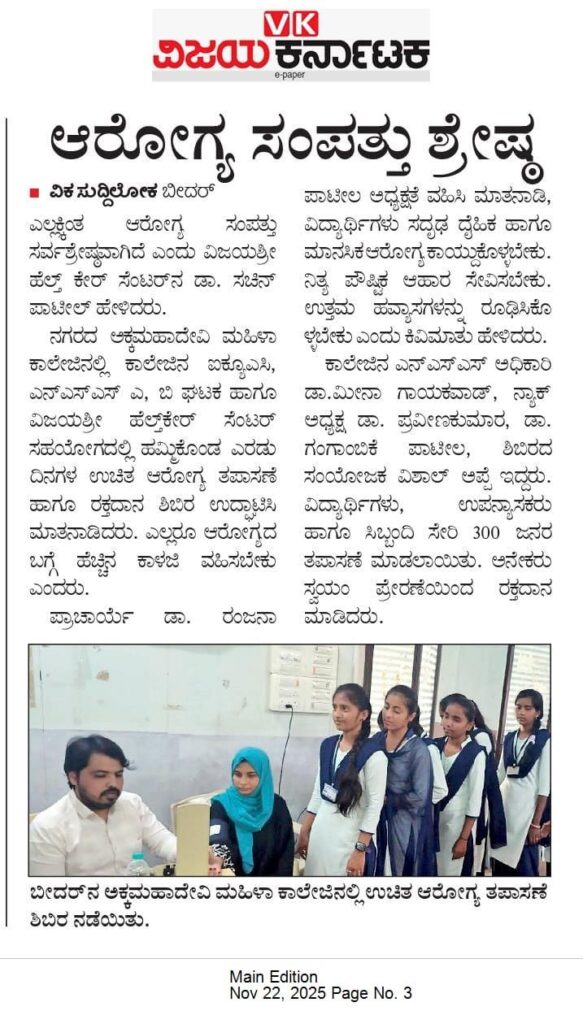 The organisers, faculty, and NSS volunteers of Akkamahadevi Mahila Mahavidyalaya expressed appreciation for the medical support and participation, highlighting the positive impact of collaborative healthcare initiatives in Bidar.